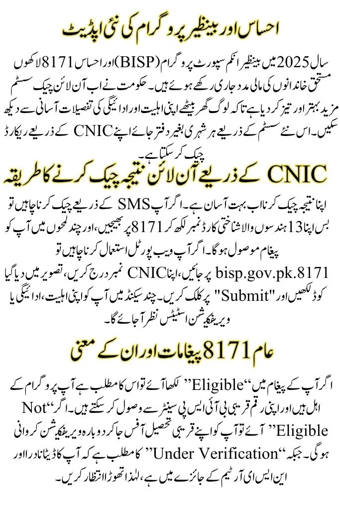For 2025, the government has made it even simpler to check eligibility through CNIC using both the 8171 SMS service and the official 8171 web portal. These digital systems are fully linked with NADRA and the National Socio-Economic Registry (NSER) for accurate verification.