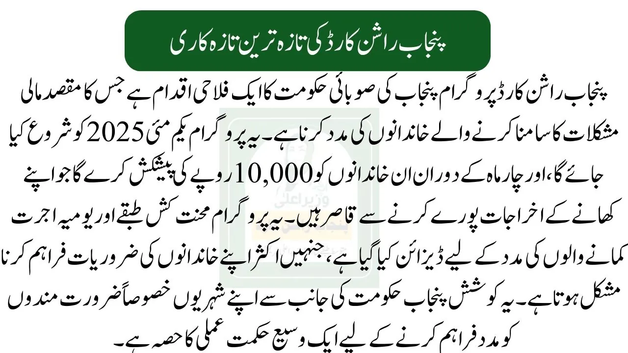 The Punjab Ration Card program is a welfare initiative by the provincial government of Punjab aimed at supporting families facing financial difficulties. This program will be launched on May 1, 2025, and will offer Rs10,000 over four months to families who are unable to meet their food expenses. The program is designed to help the working class and daily wage earners, who often find it challenging to provide for their families. This effort is part of a broader strategy by the Punjab government to provide assistance to its citizens, particularly those in need.