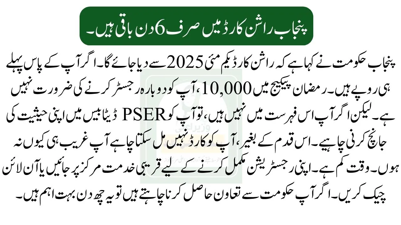 The Punjab government has said that the Rashan Card will be given from May 1, 2025. If you already got Rs. 10,000 in the Ramzan package, you do not need to register again. But if you are not in that list, you must check your status in the PSER database. Without this step, you cannot get the card even if you are poor. The time is short. Visit the nearest Khidmat Markaz or check online to complete your registration. These six days are very important if you want to get support from the government.